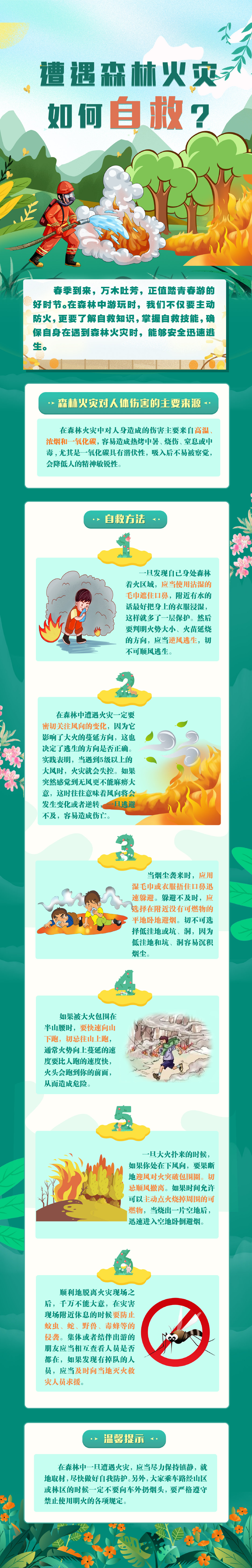 #森林草(cǎo)原防火季#【遭遇森林火災如何自救?】春季到來,萬木(mù)吐芳,正值踏青春遊的好時節。進入森林前,除了要做到不攜帶火種上山(shān)、不在林區(qū)吸煙等,更要了解自救知識,掌握自救技(jì )能(néng),确保自身在遇到森林火災時,能(néng)夠安(ān)全迅速逃生。